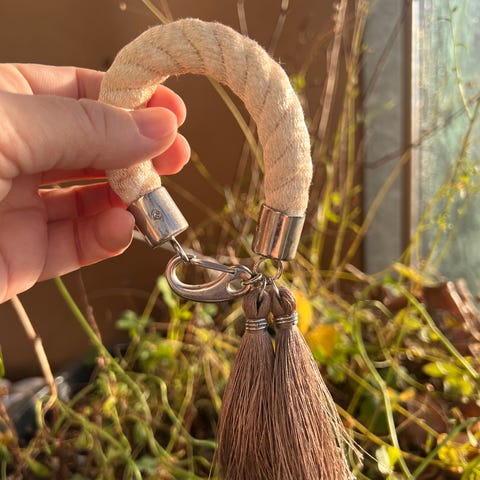 Elegant armbånd/nøgleholder fra Yayoi Jewelry i lilla tekstil med gul kvast og sølvfarvede detaljer.