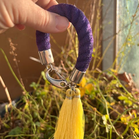 Stilrent armbånd/nøgleholder fra Yayoi Jewelry i natur/beige tekstil med brun kvast og sølvfarvede detaljer.