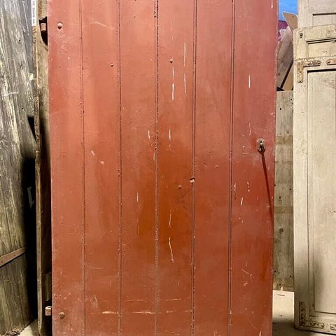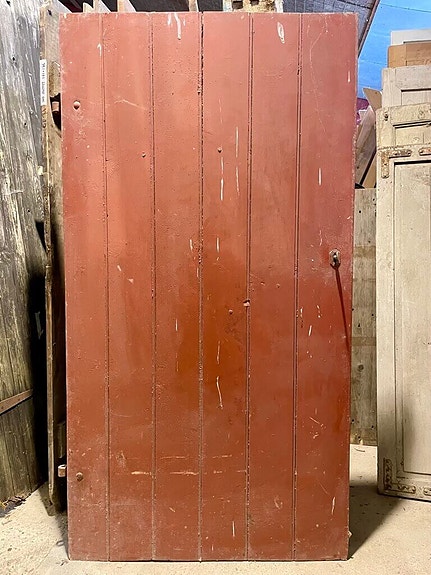 Gammel, original kælderdør sammensat af syv brædder sammenholdt med afstivning i klassisk Z-form. Uden hængsler. Træværk overordnet sundt og stedvis ormædt og slidt i enderne.