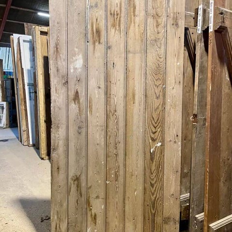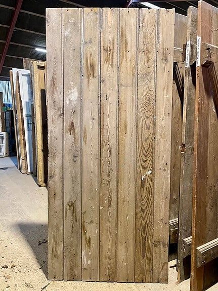 Original stalddør sammensat af seks brædder. Med originale jernhængsler (uden stabler) samt fungerende låsekasse med greb i jern. Sundt træværk, fin patina.