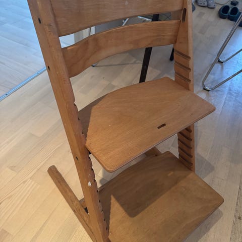 Stokke højstol i lyst træ med justerbar sæde- og fodplade.
