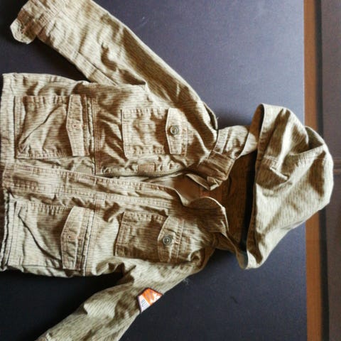 Armyfarvet, kraftig Termojakke med lynlåslukning og 2 lommer forpå. Har ribkant ved ærmer og underkant og lynlåseffekt på det ene ærme.