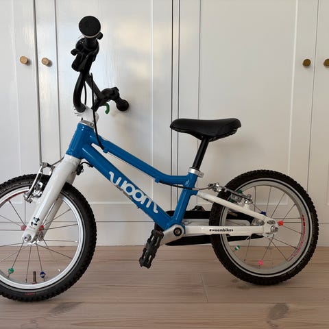 Woom børnecykel med 14" hjul, i farverne rød og hvid. Cyklen er designet til børn og har en ramme og komponenter tilpasset børns størrelse.