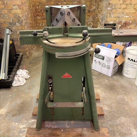 Ukendt Model træbearbejdningsmaskine med metalramme og justerbare håndtag. Maskinen er designet til præcisionsarbejde med træ og har en robust konstruktion. Farven er grønlig med metaldele. Maskinen står på en firkantet base og har en lang arbejdsflade til bearbejdning af træemner.