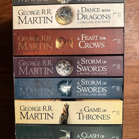 George R.R. Martin A Song of Ice and Fire bogserie indeholder alle bind samlet i en æske. Serien er kendt for sin fantasygenre og komplekse fortælling. Bøgerne er samlet i en kasse med titlen A Song of Ice and Fire.