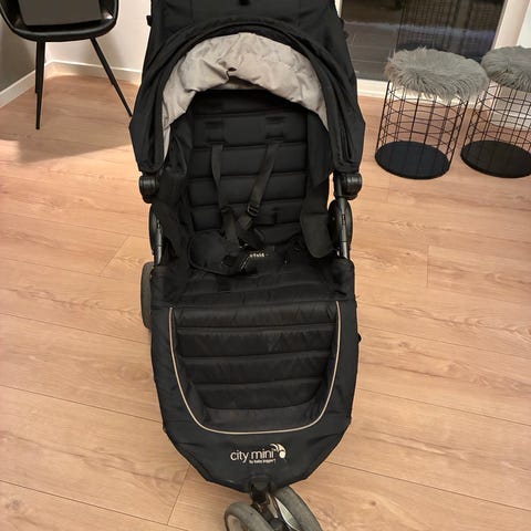 Ældre city mini gt i grå. Virker upåklageligt, men har uundgåeligt noget slid og nogle pletter, da den er blevet flittigt brugt og har været uundværlig til ture. Ryglænet kan lægges ned, så barnet kan sove lur i den. Klappes nemt sammen ved at tage i håndtaget. Fylder ikke meget i et bagagerum, da hjulene også kan tages af.