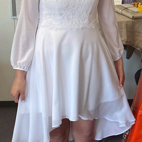 Super smuk konfirmationskjole fra Lilly model 2025 med lynlås i ryggen og lange ærmer med smukke blonder.