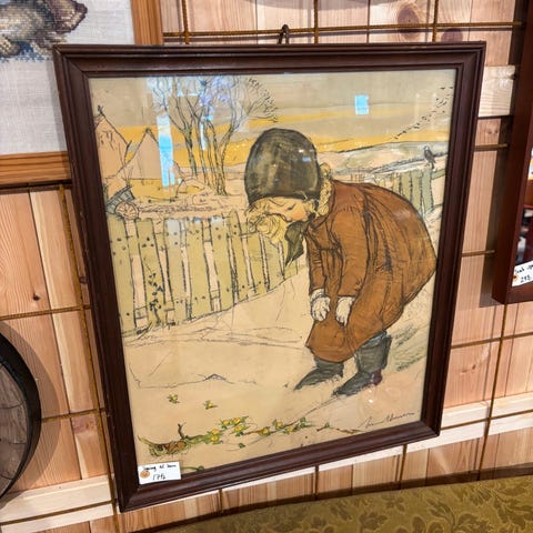 Lim Johansson indgraveret glasbillede med motiv af vinterlandskab, herunder en figur ved et vindue og sneklædte huse. Billedet er indrammet med en enkel ramme i lyst materiale. Velegnet til dekorativ ophængning.