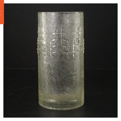 En vase lavet af klart krystal med et indviklet mønster og en facetteret kant omkring toppen. Vasen er formet med en slank midte og udvides ved åbningen. Glasvase egner sig godt til dekorative formål i hjemmet.