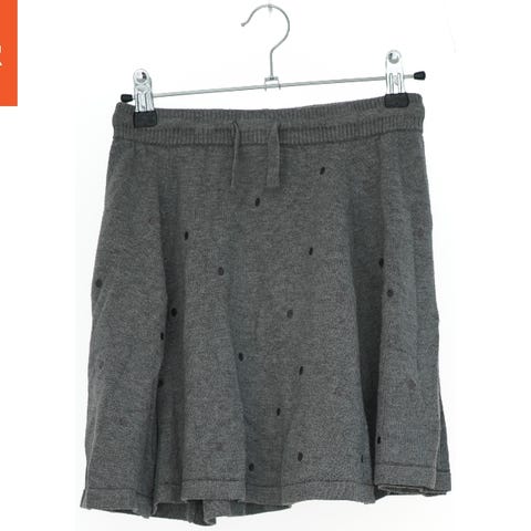 En mørkegrå nederdel til børn med pynteprikker og snøre. Nederdelen har elastisk talje og to skrå lommer foran. Der er også en falsk lomme bagpå med en lille dekorativ sløjfe. Nederdelen har en stribe på siden.