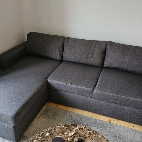 Jysk sofaseng i gråt stof med to ryglænspuder 158 cm x 60 cm h x 68 cm bredde. Den har en soda plet, som kan nemt fjernes med fx Vanish. Pris som ny 1500 kr, min pris 350 kr.