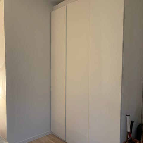 Komplet Pax skab med Vikanes låge. Det har to huller i den ene side, da det har været sat sammen med et andet skab. Køber skal selv sørge for at få det ned fra 3. sal