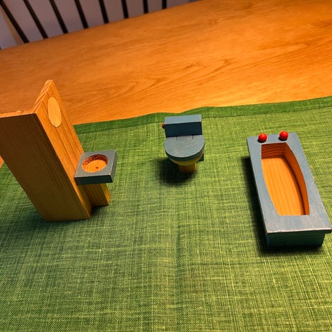 Dette er en lille plastikmodel af et toilet og en toiletpapirholder. Objektet er anvendt som legetøj eller som del af en miniature samling for dukkehuse eller lignende. Toilettet har en hvid låg og er primært orange, sammen med den orange toiletpapirholder, der har en klar stang til toiletpapiret.