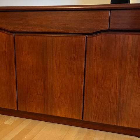 Super flot dansk produceret skænk i Eg, fra Skovby, med softclose på alle skufferne, og bestik indlæg i øverste venstre skuffe. Den fejler ingenting, men har lidt kosmetiske pletter på toppen (se billeder), fra nogle plante vi har haft stående.