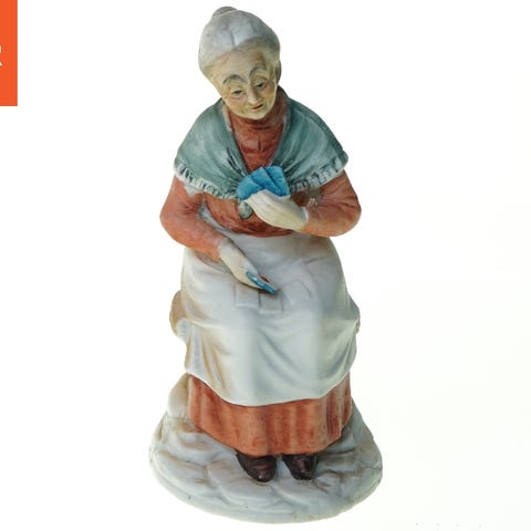 Keramikfigur lavet i en lyseblå farve, som viser en bedende gestus. Figuren er mindre og måler cirka 6 cm i højde. Detaljer om ansigt og hænder er skulpturelle funktioner, som giver et indtryk af en fredelig eller meditativ karakter. Den har en rød markering på fronten af kjolen. Bagsiden er mere enkel og viser en glat overflade.