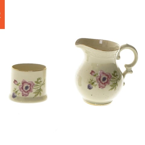 Hvid porcelænskande med dekorative udstikkende elementer på siden og en snoet hank. Kanden har en højde på 15 cm og en bredde på 14 cm. Der er nogle mindre tegn på brug indvendigt i kanden.