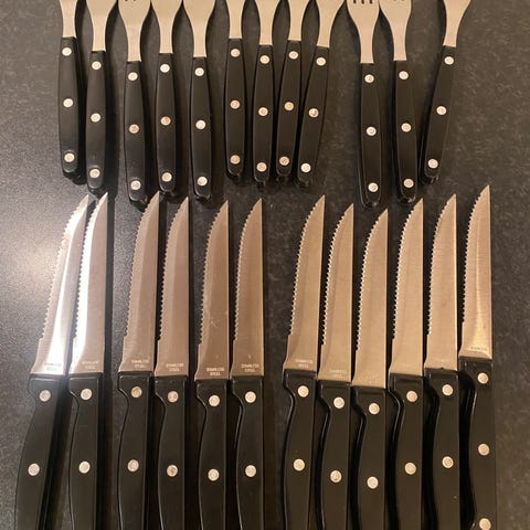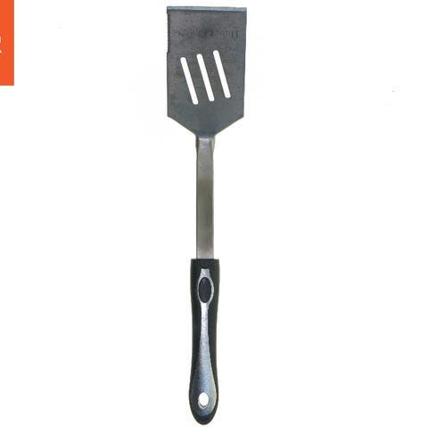 Dette sæt indeholder to grillredskaber, en tang og en palet, der begge er lavet af rustfrit stål. Redskaberne har sorte håndtag og er designet til at hjælpe med madlavning ved grillen. Tangen har tænder, der hjælper med et godt greb, og paletten har et åbent mønster med en skarp kant, ideel til at vende mad. Redskaberne er 43,5 cm lange.