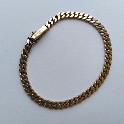 Den viste genstand er et guldkæde armbånd med rektangulære links. Armbåndet er af enkeltdesign med en sikkerhedslukning ved enden, der sikrer nem og sikker fastgørelse. Materialet ser ud til at være guld eller guldaktigt, hvilket giver en flot og elegant glans. Armbåndets omkreds er 10 cm, hvilket gør det egnet til håndled. Det kan let matches med forskellige outfits for et stilfuldt udseende. Tags: armbånd, kæde, guld, smykker