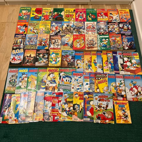 2 store kasser fyldt med jumbobøger, mammutbøger og Anders And blade