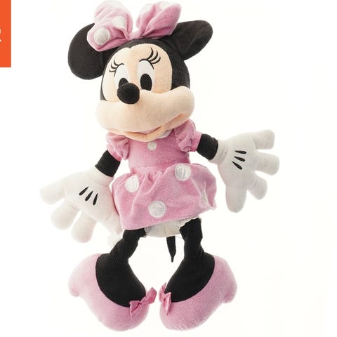 Dette er et tøjdyr, der forestiller Minnie Mouse. Tøjet inkluderer en lilla kjole med polkaprikker og en matchende sløjfe på hovedet. Tøjdyret er lavet af blødt plysstof og måler 65 cm i højden.