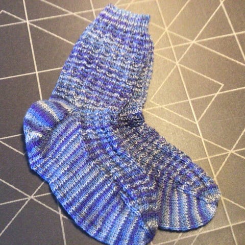 Et par håndlavede, strikkede sokker i uld. De er i en rød farve og måler 20 cm i længden. Sokkerne ser ud til at være varme og komfortable, ideelle til kolde dage.