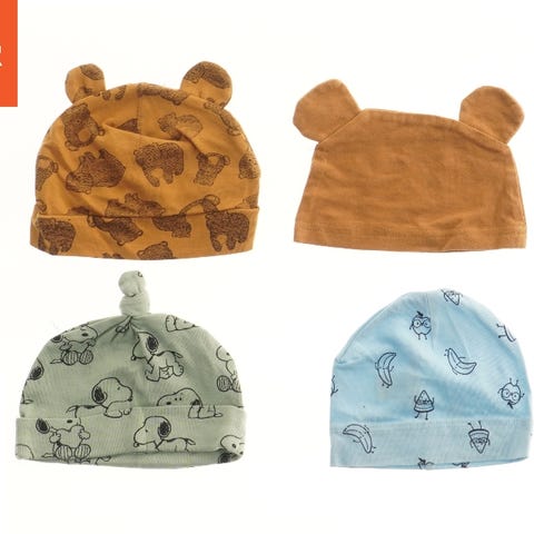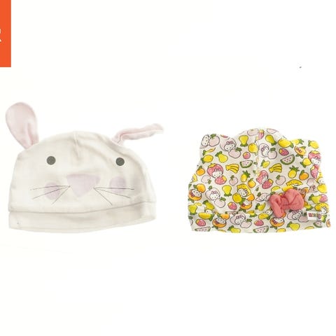 Dette sæt indeholder to små børnehuer. Den første er gul med små ører, der giver et nuttet udseende. Den har et sødt ansigt påsyet foran. Den anden hue er lys beige med et diskret mønster og en lille top. Begge huer er egnet til små børn og er lavet af blødt materiale, der er behageligt at have på.