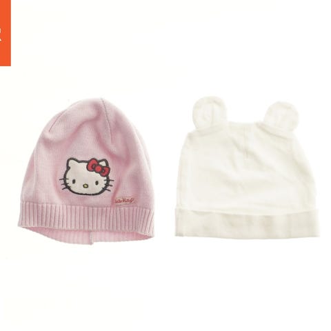 Fire forskellige babyhuer i størrelse 18,5 cm. Den første hue er sennepsgul med bjørnemønster og ører. Den anden hue er ensfarvet brun med ører. Den tredje hue er lysegrøn med Snoopy-mønster og en knude på toppen. Den fjerde hue er lyseblå med diverse tegninger af figurer og objekter.