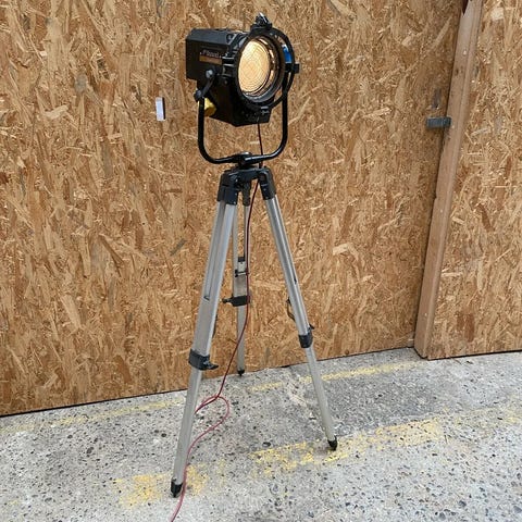 Projektør monteret på treben i farverne gul og orange.