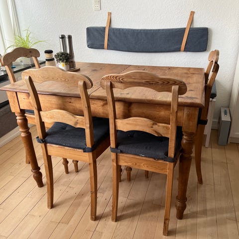 Ukendt mærke. Bord i massivt træt samt dertilhørende plade + 2 stole. Byd