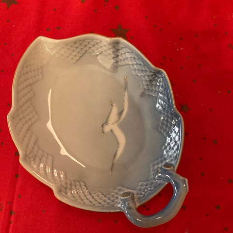 Royal Copenhagen fad med drue- og bladmønster. Fadet har en rund form med detaljerede druer og blade i relief. Det er fremstillet i keramik og har en orange baggrundsfarve med blå druer og grønne blade. Størrelsen er ikke angivet.
