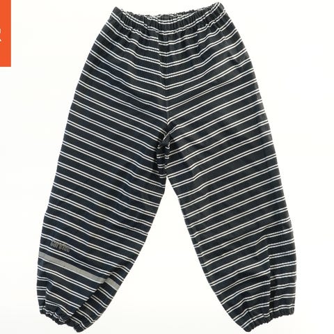 Regnbukser med sorte og hvide striber. De har elastik ved taljen og ved benkanten. Der er et refleksbånd nederst på buksebenene.