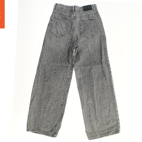 Et par lyseblå jeans med slid detaljer på forsiden. Disse bukser har en knap- og lynlåslukning, samt to forlommer og to baglommer. Bagpå er der en elastisk talje og et mærkat øverst på linningen.