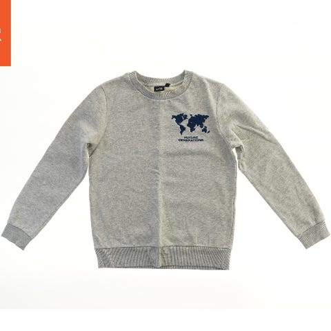En grå sweatshirt med rund halsudskæring og ribkanter ved ærmerne og taljen. Foran er der et print med et verdenskort og teksten 'FUTURE GENERATIONS'.