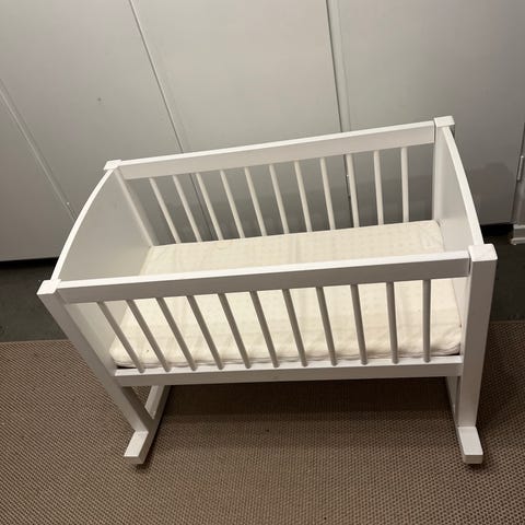 Vugge i hvidt træ med rundet design og tremmesider. Udstyret med hjul for nem flytning. Egnet til spædbørn.