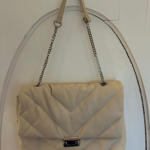 ysl Home taske i beige farve lavet af læder. Tasken har en skulderrem og en top-håndtag. Den har en lynlåslomme indvendigt og et logo på forsiden. en kopi ysl taske den er