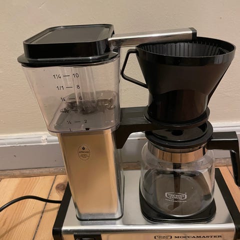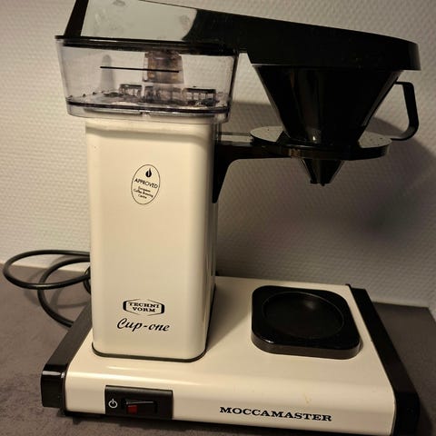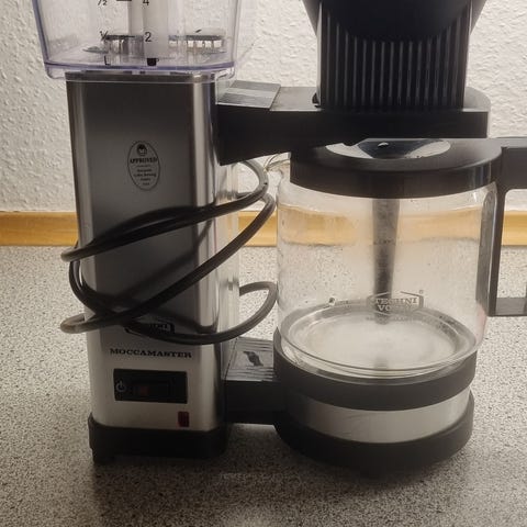 Hysterisk velholdt Moccamaster kaffemaskine med glaskande, transparent vandbeholder, varmekontrol og er ekstremt nem og sikker at bruge. Man kan desuden justere vandgennemstrømningshastighed, hvis man ønsker en lidt stærkere kaffe end normal. Kan også bruges økonomisk, så kaffen rækker lidt længere.