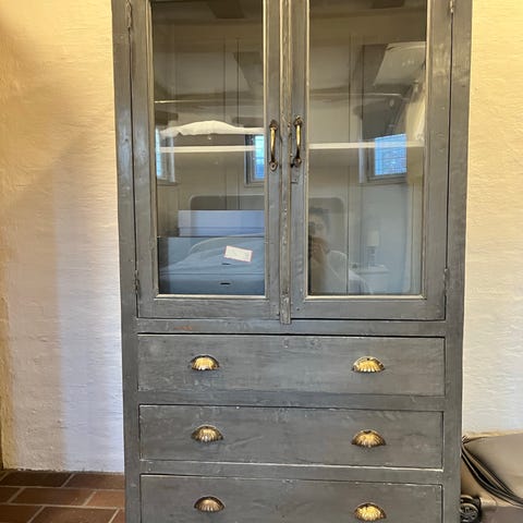 Jeg sælger mit flotte vitrineskab fra The traveling band (hjemmeside https://thetravellingband.dk/products/vitrineskab-tt32-90x46x190-cm). De laver kun én af hver model, så det er et skab, man ikke finder andre steder. Det står som da jeg købte det, da det kun er blevet brugt til opbevaring af vinglas osv.