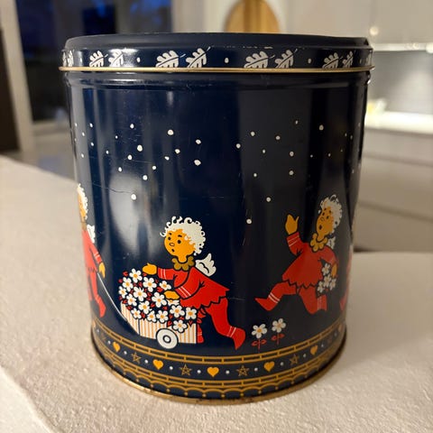 Skøn stor rund kagedåse,gamle kagedåser,retro kagedåse i brun, grøn & orange ; 70' er style orange kagedåse,rund blikdåse,mål 24 x 10 cm, almen let patinering,Blomstret kagedåse kan ses/hentes i Esbjerg Midtby, sendes gerne