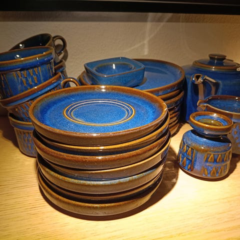 Komplet søt Søholm stentøj fra Bornholm - klassiske danske opbevaringskrukker i keramik. Sættet består af 7 krukker til: Gryn, kakao, kaffe, mel, sukker, the og salt. De fleste har korklåg, og saltkrukken har trælåg - alle originale i god stand. Sælges samlet og billigt for hurtig afhentning. Kr. 300 for alle 7. stk. Fast pris.