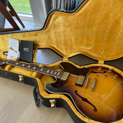 Gibson ES-335 halvakustisk Dot fra 2019guitar i rød farve. Modellen har en klassisk krop med f-huller, to humbucker pickupper, Guitarens hals og krop er designet til at give en balanceret lyd, velegnet til forskellige musikgenrer.Hals Pickup: MHS II Humbucker rytme