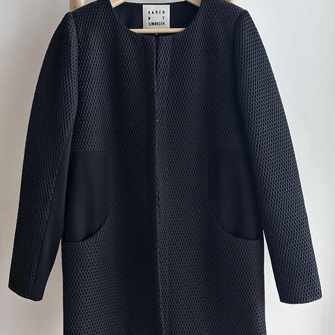 Habitjakke med revers i stærke farver og i kraftig kvalitet. Jakken kan lukkes til med en knappe fortil, der er 3 lommer på fronten. Ærmerne kan smøges op, hvorved det bløde silke/satin for kommer til syne.