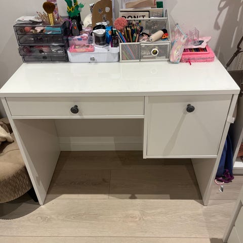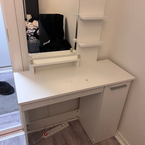 Sminkebord, fejler intet- men der er lidt makeup spor både på bordet og lidt i skufferne. Det meste kan gøres rent, har desværre ikke selv tid til det.