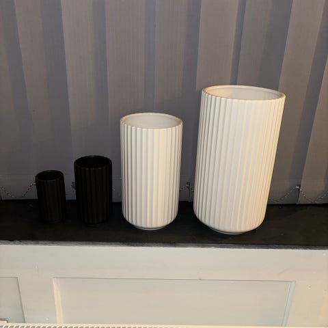 4 forskellige størrelser. 15 cm høj = 300 kr - 12 cm høj = 200kr - 10 cm høj = 75 kr - 6 cm høj = 50 kr. En dekoration i sig selv, når de står samlet - selv uden blomster. Sælges hver for sig eller samlet for