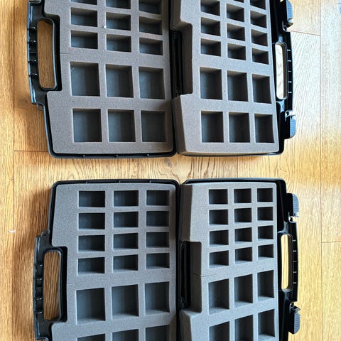 Fyrretræssætterkasse med 57 rum i fin stand med både lodret og vandret ophæng. Udvendige mål: 42,5 x 35,5 x 4 cm. De mindste rum måler indvendigt: 4 x 3,2 og er 3 cm dybe, de største måler: 9 x 4,5 og er 3 cm dybe. Fin til Warhammerfigurer mm. Pris: 100 kr kontant ved afhentning. Se gerne mine andre annoncer.