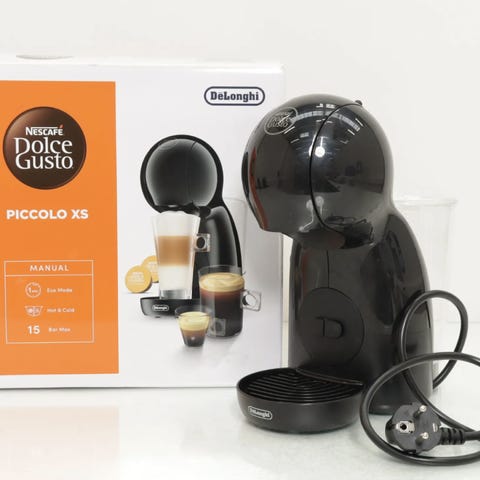 Dolce Gusto kaffemaskine i sort og hvid farve. Kaffemaskinen har et kompakt design og er egnet til tilberedning af forskellige typer kaffe. Den har en rund form med kontrolpanel på toppen og en aftagelig drypbakke.