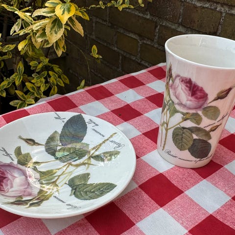 Tandkrus, sæbeskål, toiletbørste, 2 små fyrfadsstager, 2 små skåle med låg.