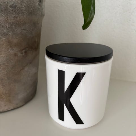 Design Letters krukke med bogstav P, lavet i hvidt porcelæn. Krukken har et rundt hul i bunden og er designet til opbevaring eller dekoration.