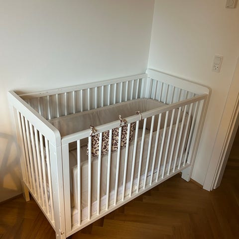 Der er bygget en kort side til, men orginalen medfølger naturligvis. Sengen er designet til at give sikkerhed og komfort til små børn under søvn. Den har tremmer omkring alle sider, som sikrer, at barnet ikke falder ud. Sengen kan bruges som en del af børneværelsets møblering.