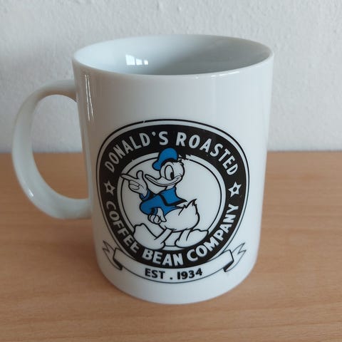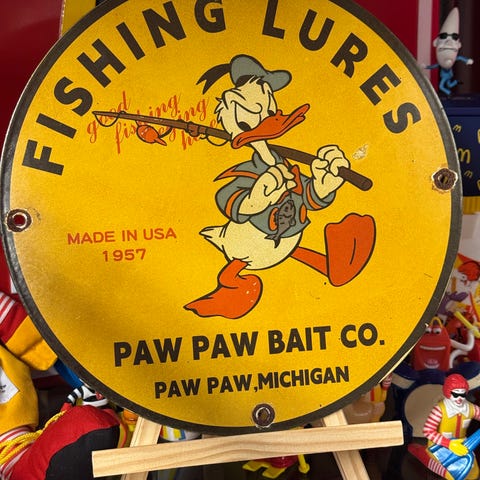 DK skilt med motiv af tegneseriefiguren Donald Duck. Skiltet er ovalt og har huller til ophæng. Farverne inkluderer hvid baggrund med sort, rød, gul og blå grafik.