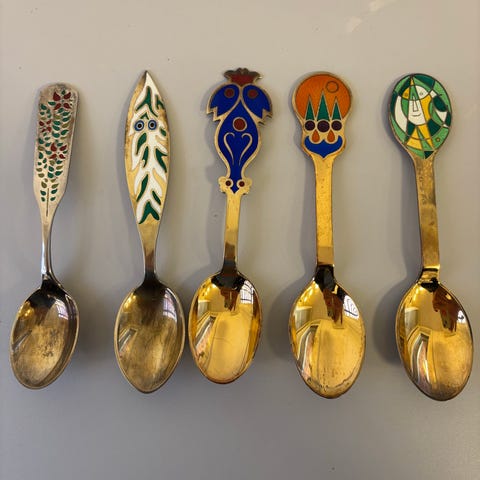 Sæt bestående af fire skeer med , dateret 1971, 1973, 1974 og 1976. Skeerne er forgyldte og passet godt på. Egnet til samlere eller som julepynt.
